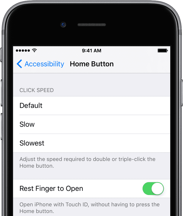 Settings > General > Accessibility > Home Button >Toggle on and toggle on the switch for Rest Finger to Open