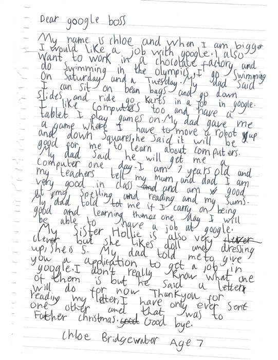 Don’t ask, don’t get, right? On that principle, seven-year-old Chloe Bridgewater, who lives in Hereford, UK, wrote a letter to Google asking for a job.