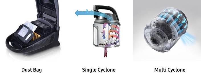 - Dust Collector. There are two kinds of dust collectors – one uses a bag, the other does not require bags. A vacuum with a dust bag tends to be light, but the user has to buy and replace the bags at certain intervals. The so-called “bagless” collectors can be further divided into the single cyclone type and multi cyclone type. The single cyclone collector is a bit heavier than a dust bag vacuum, but it sustains suction power longer without changing a bag. The multi cyclone type, on the other hand, is heavier and has more complicated structure inside, but maintains its suction power longer than single cyclone.