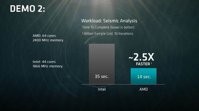 In the land of benchmark numbers we can’t verify (yet), AMD showed demonstrations at the recent Ryzen Tech Day. The main demonstration was a sparse matrix calculation on a 3D-dataset for seismic analysis. In this test, solving a 15-diagonal matrix of 1 billion samples took 35 seconds on an Intel machine vs 18 seconds on an AMD machine (both machines using 44 cores and DDR4-1866). When allowed to use its full 64-cores and DDR4-2400 memory, AMD shaved another four seconds off. Again, we can’t verify these results, and it’s a single data point, but a diagonal matrix solver would be a suitable representation for an enterprise workload. We were told that the clock frequencies for each chip were at stock, however AMD did say that the Naples clocks were not yet finalized.