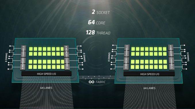 Naples will be offered as either a single processor platform (1P), or a dual processor platform (2P). In dual processor mode, and thus a system with 64 cores and 128 threads, each processor will use 64 of its PCIe lanes as a communication bus between the processors as part of AMD’s Infinity Fabric. The Infinity Fabric uses a custom protocol over these lanes, but bandwidth is designed to be on the order of PCIe. As each core uses 64 PCIe lanes to talk to the other, this allows each of the CPUs to give 64 lanes to the rest of the system, totaling 128 PCIe 3.0 again.