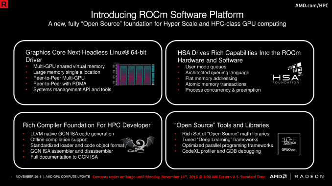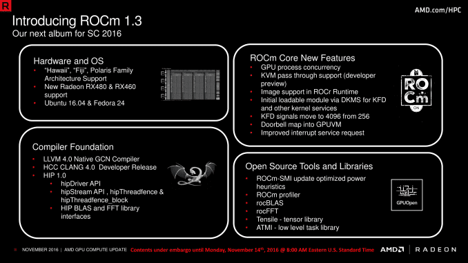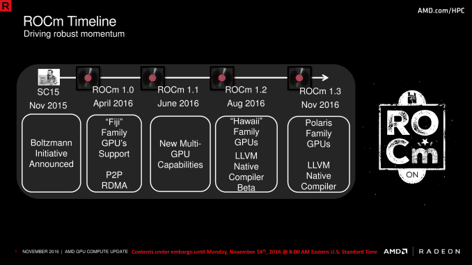 Now at SC16, the company is both updating participants on the current state of Boltzmann, along with providing the latest software update to the project. Now going under the name the Radeon Open Compute Platform – ROCm – AMD shipped the initial 1.0 version of the platform back in April of this year. That initial release however was, relative to the complete scope of Boltzmann, only the tip of the iceberg. A good deal of what AMD ultimately wanted to do with Boltzmann was not ready (or at least still in beta) with earlier ROCm releases, and it’s not a coincidence that ROCm 1.3, being announced today at the show, is much closer to completing the Boltzmann Initiative.