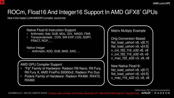 ROCm 1.3 also introduces several new features to the platform as a whole. Of particular note here, AMD has enabled support for 16bit floating point and integer formats within the platform. As regular readers may recall, AMD has offered native support for 16bit formats since GCN 1.3 (Tonga/Fiji), so this functionality is finally being exposed on ROCm. It should be noted however that this is not the same as packed 16bit formats, which allow for AMD’s 32bit ALUs to process two 16bit instructions at once, gaining FLOPS versus using 32bit instructions. Instead, the immediate purpose of this is to allow developers to leverage the space-saving aspects of 16bit data formats, reducing memory and register pressure by using smaller data types when lower precision is suitable, and cutting down on the number of instructions as well by avoiding unnecessary conversions.