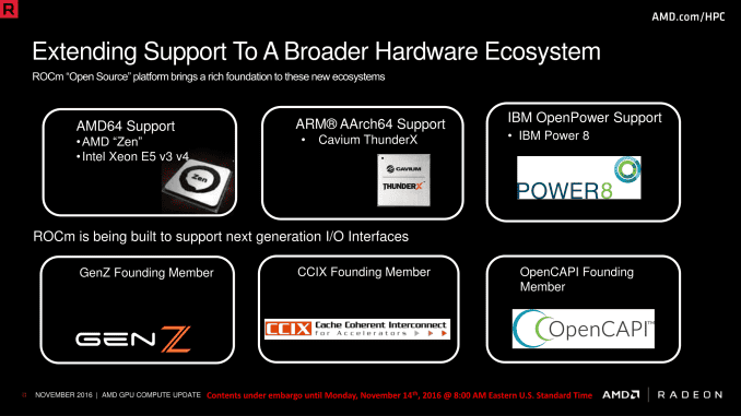 AMD is also using SC16 to further outline their platform support plans. Along with x86 support – including of course, Zen – AMD is also going to be supporting ARMv8 AArch64, and IBM POWER8. The former is an interesting choice since ARM in the server space has to date been mostly about microservers and other forms of high density computing, while adding POWER8 support is a logical step to take in order be able to play in the same hardware space that NVIDIA does as part of OpenPOWER’s “anyone but Intel” consortium. The addition of POWER8 support also offers an interesting sign of where AMD might go in the future; along with POWER8, they are also supporting the OpenCAPI interface that future POWER CPUs will use. Could this mean that AMD will offer HPC-class GPUs with more than just PCIe support in the future?