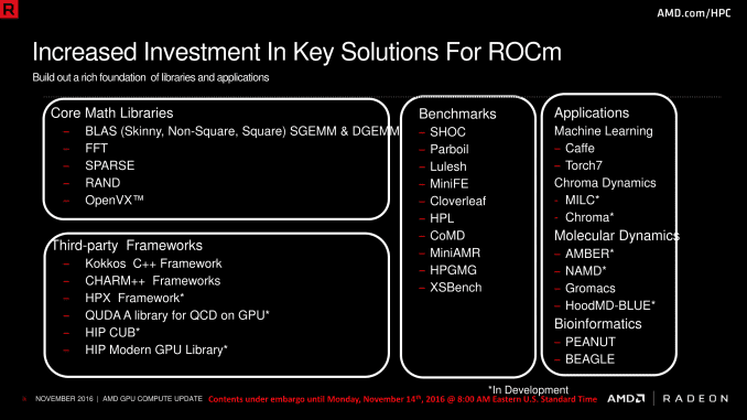 Wrapping things up, while ROCm 1.3 brings AMD much closer to fulfilling the original vision of the Boltzmann Initiative, the company still has some work to do and is offering a brief look at their future software plans. Now that AMD has the core platform sorted out, they’re going to be increasing their investment in major libraries and frameworks used by many HPC applications. This includes fundmental math libraries like BLAS and FFT, but also major frameworks like AMBER and the aforementioned CAFFE. Along with presenting a sane, developer-friendly language, one of CUDA’s other great strengths has been libraries/frameworks, so this is where AMD will be catching up next. And while AMD isn’t laying out any specific dates on the hardware or software side, the way the stars are aligning right now, I’m not going to be too surprised if they’ll be ready to finally fully tackle NVIDIA with the 1-2-3 punch of ROCm, optimized software libraries, and Vega GPU hardware by the time we’re reporting on SC17 at this time next year.