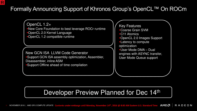 Moving on, AMD has now added “OpenCL 1.2+” support to ROCm. AMD’s history with OpenCL has been long and somewhat tortured – AMD’s bet on OpenCL has not been well rewarded – so this one caught my eye. The oddly named “1.2+” support reflects the fact that AMD isn’t implementing a full OpenCL 2.0 stack on top of ROCm, but rather they’re targeting existing OpenCL 1.x users. The end result is that ROCm’s OpenCL support is based around the 1.2 stack, but that it supports a select subset of the OpenCL 2.0 kernel language. The OpenCL runtime itself radically changed with 2.0, due to the introduction of SPIR-V, so how AMD is going about supporting OpenCL is important. They are essentially offering OpenCL 1.x users a souped up version of OpenCL 1.x, backporting several 2.0 features while retaining the 1.2 runtime. It’s a logical choice to offer a path forward to their existing OpenCL customers, and consistent with AMD’s previous sentiment on OpenCL. AMD’s future is in HCC and C++, not OpenCL.