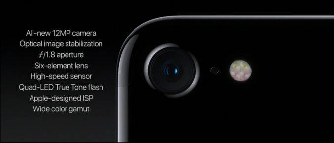 At the other end of the spectrum then are the iPhone 7 series’ new rear and front facing cameras. Starting with the iPhone 7, Apple has retained a 12MP sensor (sensor manufacturer unknown), however they have significantly improved the feature set available. The new camera module is capable of taking wide color gamut photos to go along with the WCG-capable display. Furthermore, in a rarity for a sub-5” phone, the iPhone 7 now includes optical image stabilization (OIS) for both photos and video recording, a feature that was previously only available on the larger Plus phones. The new camera is composed of a six element lens, and along with its other improvements, the sensor is said to be 60% faster and 30% more energy efficient than the previous-generation sensor in the iPhone 6s. Also augmenting the new camera is an updated true tone flash light; the new module is composed of 4 LEDs, allowing for what Apple says is 50% more illumination than the iPhone 6s.