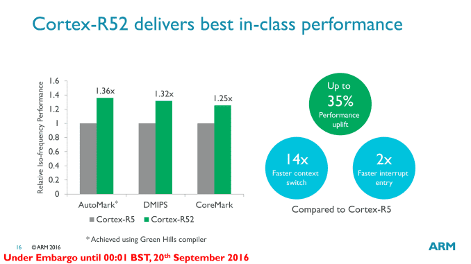 As the Cortex-R series is focused on determinism and real-time responsiveness over total performance, ARM doesn’t heavily promote these cores on the basis of performance. But at least within the Cortex-R family, they are talking about a performance increase of upwards of 35% in common CPU benchmarks. More important for this market than throughput however is responsiveness: for the R52, ARM has done some specific work to improve interrupt entry and context switching performance, doubling the former and achieving a staggering 14-fold increase on the latter.
