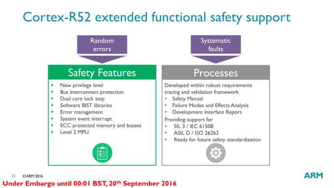 On the safety side of matters, the R52 has a few different error-resiliency features to ensure accuracy. Multi-core lock step returns for this design, allowing two R52 cores to execute the same task in parallel for redundancy. And on the memory side of matters, ECC is offered across both the memory busses and the memory itself, in order to avoid random bitflips.