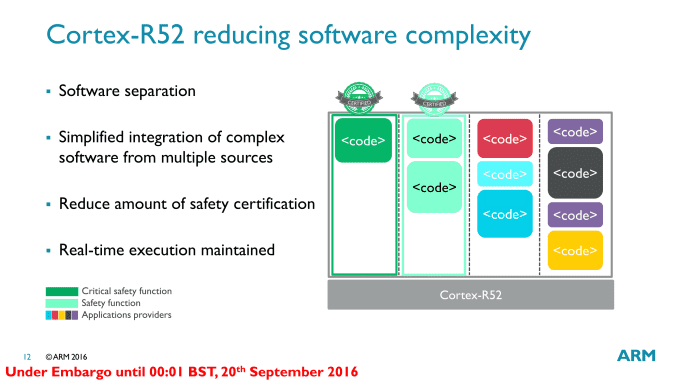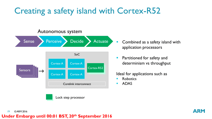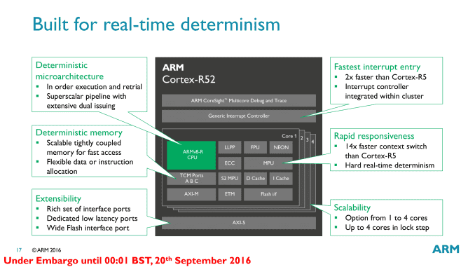 Now just under 3 years later, ARM is announcing their first ARMv8-R CPU design this evening with the Cortex-R52. An upgrade of sorts to ARM’s existing Cortex-R5, the R52 is the company’s first implementation of ARMv8-R. R52 makes specific use of many of the new features enabled by the architecture, while improving performance at the same time. ARM is pitching the new CPU core at markets that need a safety-critical CPU – a market that the Cortex-R series has been in for a while – where the deterministic nature of the CPU’s execution model is critical to ensuring quick and accurate execution.