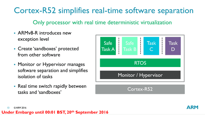 Meanwhile in terms of new functionality for hardware developers, as part of ARMv8-R, Cortex-R52 implements support for hardware virtualization. Like virtually everything else in R52, this is deterministic as well, with the hypervisor working with the MPU to offer each guest OS its own section of the physical memory space. According to ARM this is a particularly important advancement, as previous means of separating tasks on real-time CPUs were non-deterministic, which is an obvious problem for the target market.