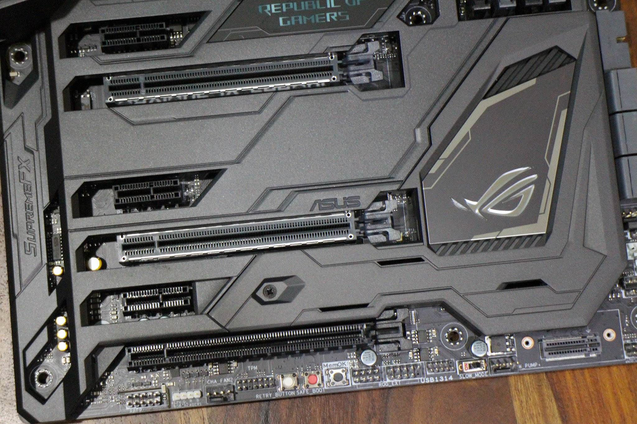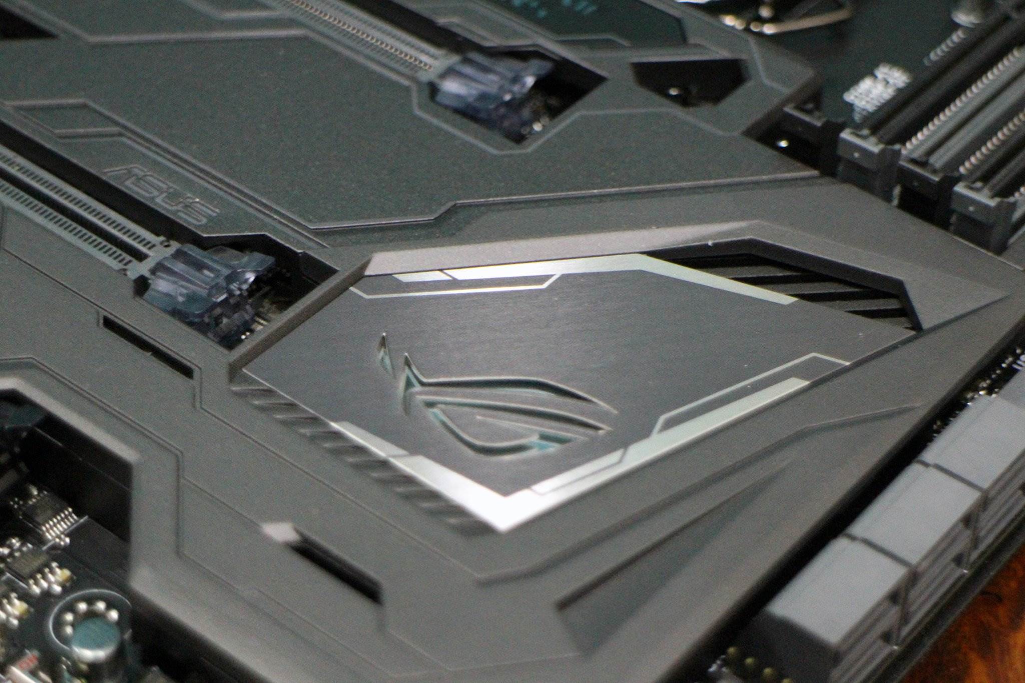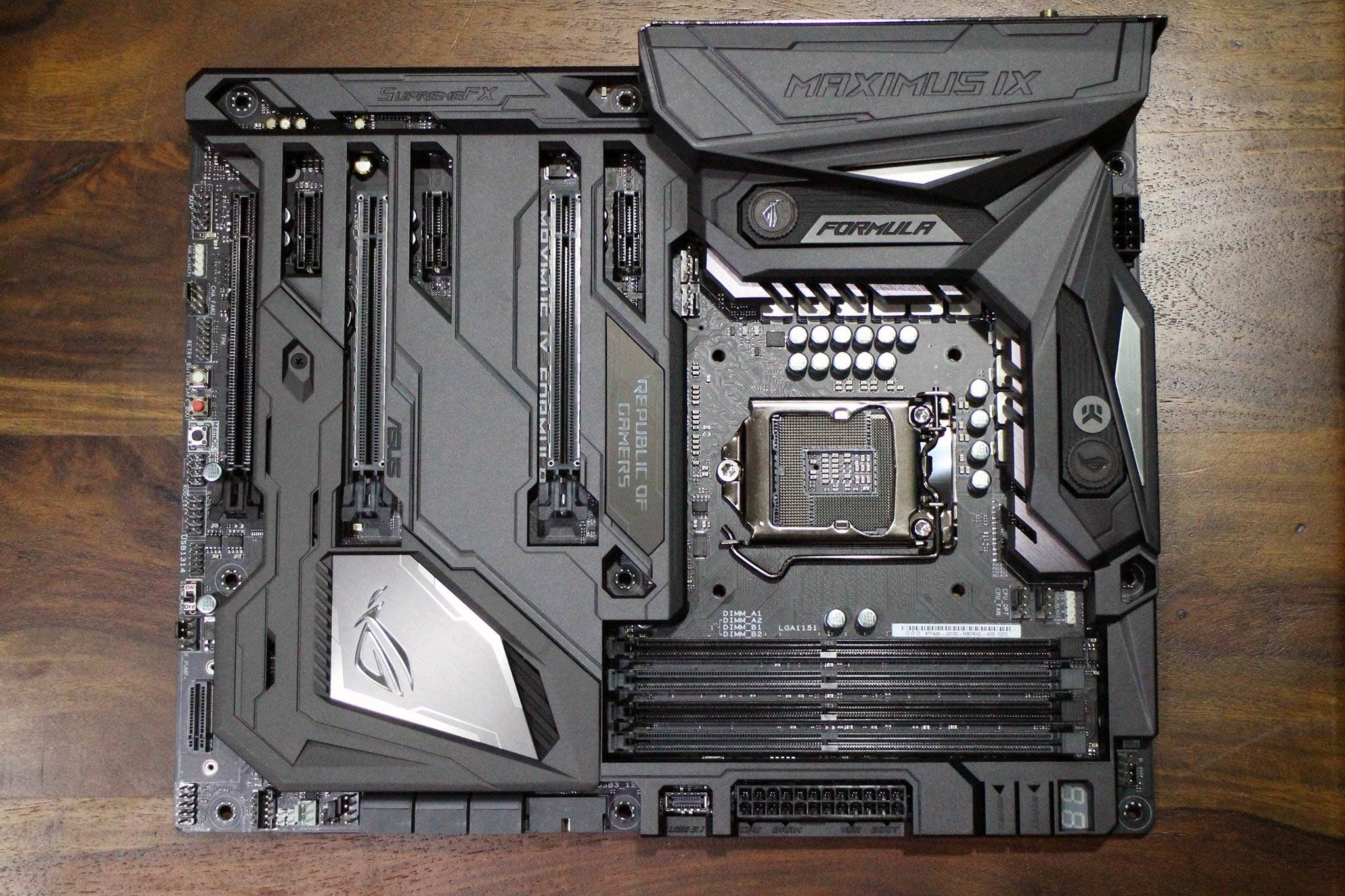 The Maximus IX Formula sports an interesting grey-on-black paint scheme, and instead of overlaying accent colors on the board itself (there’s a lot of red around the rear I/O), ASUS went with its Aura RGB LED lighting scheme.