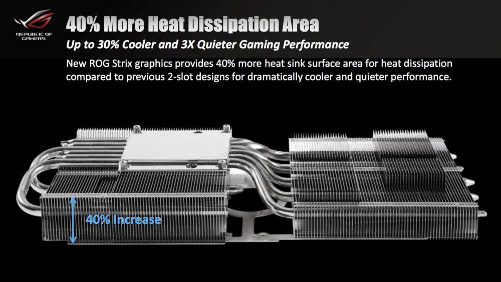 As far as the core specs go, they are obviously identical to the reference GeForce GTX 1080 Ti. It features a total of 3584 CUDA cores and 11GB of GDDR5X memory with a 352-bit memory bus. The slides below also suggest that Asus has done a great work with the cooling solution on the card. The slides claim the card runs quieter than the Founders Edition card by an impressive margin, while also running cooler. It will also include a 10+2 phase VRM and draw power using dual 8-pin power connectors.