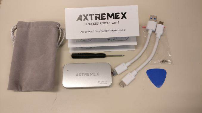 The Axtremex Micro SSD Gen 2 case is made of a zinc alloy and feels more solid in hand compared to aluminum / plastic enclosures. The package also includes a pouch with two compartments (one inside the other). One can be used for the main unit, while the other can be used for storing the cables. This ensures that the drawback associated with a non-integrated cable is addressed and the possibility of misplacing the cable is minimized. Two cables (Type-C to Type-A and Type-C to Type-C) are included to enable connecting to a wide variety of host systems. They are relatively short when compared to other storage bridges that we have evaluated before – However, thanks the compact size of the unit, it feels more like a USB flash drive with an extension cable.