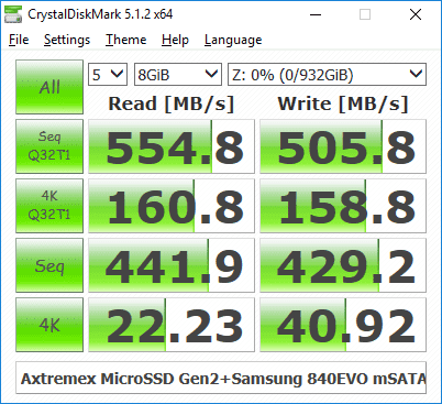 Our evaluation routine for storage bridges borrows heavily from the testing methodology for direct-attached storage devices. The testbed hardware is reused. CrystalDiskMark is used for a quick overview, as it helps determine availability of UASP support and provides some performance numbers under ideal scenarios. Real-world performance testing is done with our custom test suite involving robocopy bencharks and PCMark 8’s storage bench. The Crucial MX200 has usually been used for our storage bridge tests. However, we were unable to source the mSATA version of the same. Therefore, a Samsung 840 EVO mSATA 1TB SSD was used for the performance benchmarks below. Note that a direct comparison with other configurations using the Crucial MX200 is not quite fair, but, given similar SSDs, we should expect the performance of the Axtremex Micro SSD Gen2 to be similar to the StarTech.com S251BU31C3CB mentioned earlier.