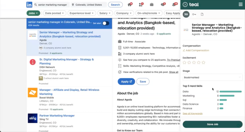 Teal’s Chrome extension additionally enables you to save instantly from the job board and consider it instantly in your tracker, so that you don’t get overwhelmed with switching tabs and bookmarking them.