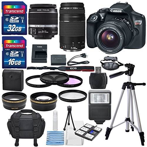 Accessory bundle contains an EF-S 18-55mm f/3.5-5.6 IS II Lens, EF 75-300mm f/4-5.6 III Lens, EOS shoulder bag, 32 &16GB memory cards, 58mm 2.2x telephoto professional lens, Pro Series HD 58mm wide angle lens, 3 Piece 58mm filter kit, digital ultravi