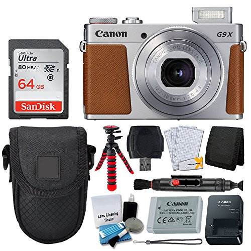 Canon PowerShot G9 X Mark II Digital Camera (Silver) – Sandisk Ultra SDXC 64GB 80MB/S C10 Flash Memory Card – 12-Inch Flexible Tripod with Flexible, Wrapable Legs, Quick Release Plate and Bubble Level (Red/Black)