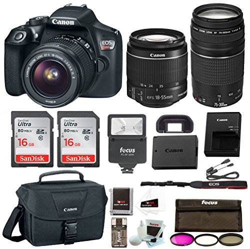 Includes – Canon EOS Rebel T6 DSLR Camera w/ EF-S 18-55mm f/3.5-5.6 IS II Lens / Canon EF 75-300mm f/4-5.6 III Telephoto Zoom Lens / Focus Filter Kit 3-Piece 58mm / Two SanDisk Ultra 16GB SD Cards / Focus FC-3000 Digital Slave Flash / Canon 100ES EOS DSLR Camera Gadget Bag / 5 Piece Digital Camera Accessory Kit