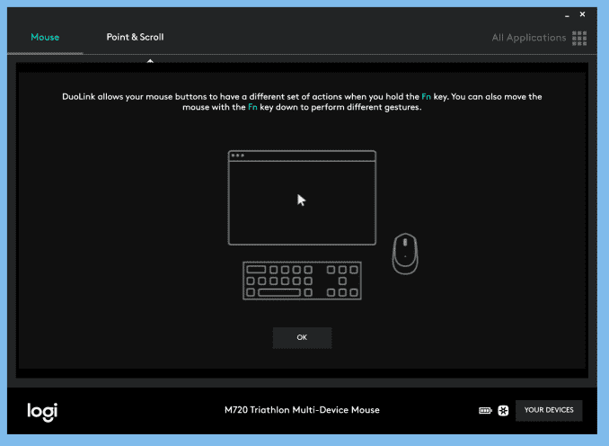 Hardware-wise, the mouse component of the MK850 is the M720 Triathlon (the sticker on the back of the mouse even has the M720 Triathlon label). The mouse is also the component in the package with a compartment to store the Unifying receiver. As part of the MK850 combo, the differences boil down to the DuoLink feature controlled by the Logitech Options software.