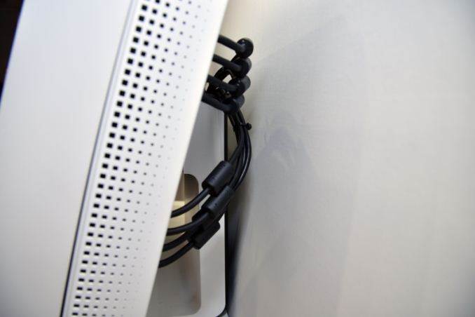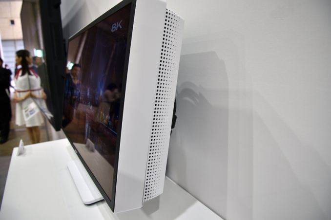 So this is where the Sharp monitor on display at CEATIC gets interesting. The IGZO display is down at 27-inches, marking a 326 PPI, just hitting at the door of large FHD smartphone displays. The panel is also listed at 1000 nit brightness. But to double down on specifications, the stand listed the display as supporting 120 Hz while in 8K mode, and also supporting High Dynamic Range, or HDR. This requires a large amount of data to be pumped into the display, and as a result a photograph of the rear shows eight separate DisplayPort cables being used in order to give the display the data it needs. 8K120 with HDR is no easy task, suggesting 7680×4320 at 10 bits per color channel (so 30-bit for RGB) at 120 times a second would suggest needing 120 gigabits per second of bandwidth at a minimum (or 15 GB/sec). That’s even before you discuss overhead, which will push that higher.