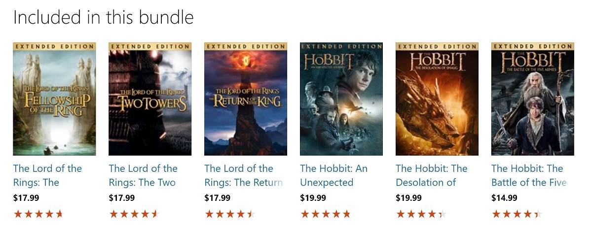 You can now purchase the whole Middle Earth series (all three Lord of the Rings and all three Hobbit movies) for only $44.99, less than half the usual $108.94 price.