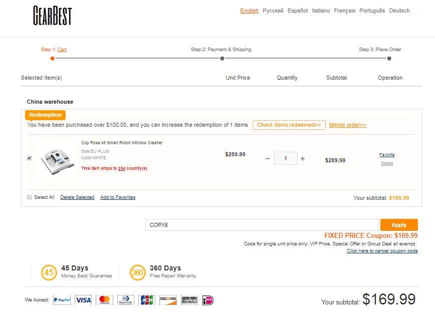 The Cop Rose x6 Smart Robot Window Cleaner is currently on sale at Gearbest for $259.99. But you can get it for $169.99 if you use the coupon code. Note that only 20 units are available for this coupon and the number is decreasing daily.