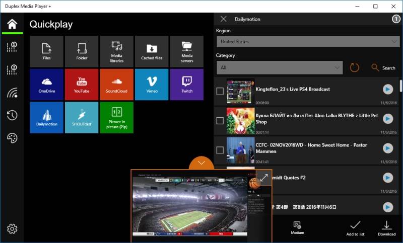 Duplex Media Player is an innovative universal player designed to bring unique features to Windows users such as Picture in Picture (Pip), Cast to Chromecast and DLNA devices, record and download media content to local storage, automatic search/download of subtitles, browse and play directly from OneDrive, network media servers, online sources and more…