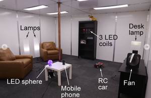 Disney built a mock living room to test its wireless charging technology. Devices such as a smartphone, a lamp, a remote control car and a fan were charged up by the roaming energy. 1900 watts were sent into the room; any more could be dangerous to the human body. In the middle of the room is a long copper pole containing a ring of 15 capacitors. The wall, floor and ceiling are made from aluminum panel.