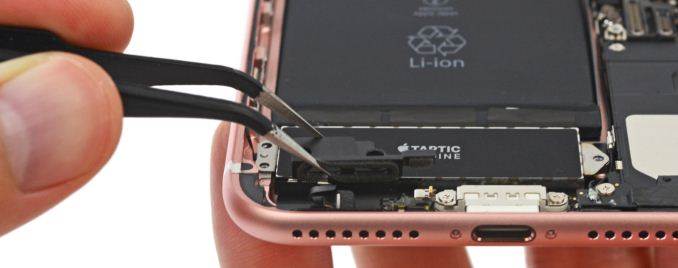On that note, the Chipworks and iFixit teardowns also show us what’s gone in the place of the now-absent headphone jack: Apple has placed a taptic engine (linear actuator) for the solid state home button, and an unusual plastic bumper.