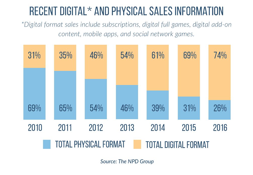 Over the past 5 or so years, the gaming industry has changed dramatically, and while some factors remain the same like the types of games customers buy, there has been a substantial push towards digital purchases. The Entertainment Software Association (ESA) put out a report today which highlights the changes that took place over the past year in the United States and compares them to historical trends. The highlight of the report—aside from the best-selling games—has to be the fact that digital sales accounted for 74% of 2016’s game purchases in the country.
