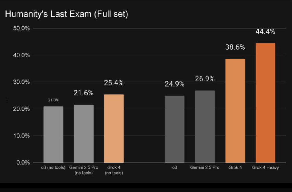 And the numbers truly again that up: It’s legitimately spectacular. On Humanity’s Last Exam (the toughest reasoning check for AI), it scored 26.9% with none instruments — that’s large when you think about most people solely get round 5%. With instruments? It jumps to 41%. But right here’s the place it will get wild: When they unleashed 32 Grok brokers working collectively, it hit 50%.