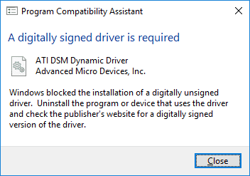 An example of a warning notice for a driver now blocked under Windows 10 Anniversary Update