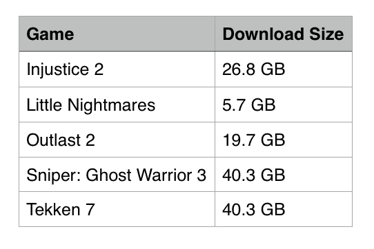 It’s surprising how Sniper: Ghost Warrior 3 and Tekken 7 have the exact same sizes. It’s also surprising how small Injustice 2 is given the fact that Mortal Kombat X is around 40 GB on Xbox One. Developers are using uncompressed audio and high-resolution textures and these games look and sound phenomenal. Unfortunately, this is at the expense of the consumer. When you purchase a console nowadays, you either have to opt for the most expensive model with the most storage or purchase a separate external hard drive.