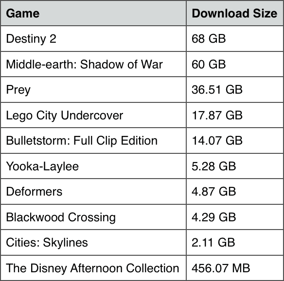 We recently reported on the file size for Destiny 2 and how it’s expected to be around 68 GB at launch. However, what about the other major games coming out in the coming weeks? A quick run through of the Xbox Store provided a lot of insight into these titles. While games like The Disney Afternoon Collection are less than 500 MB on the console, experiences like Middle-earth: Shadow of War approach Destiny 2 territory. The download sizes of some upcoming games are as follows: