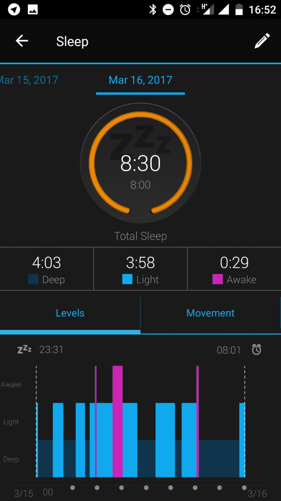 It also measures your sleep quality, giving you metrics as to how much deep sleep, light sleep and time spent awake the previous night, which I believe is fairly accurate since it doesn’t just rely on movement sensors to conclude the above data, but utilising the heart rate variability algorithms as well.