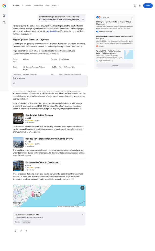 A immediate like “Find the best flight options from Miami to Toronto for the last weekend of June, comparing layovers vs. direct. Then, using the arrival times, suggest three downtown hotels under $200/night with easy airport transit access” lets the AI do the cross-referencing legwork, presenting you with a synthesized shortlist.