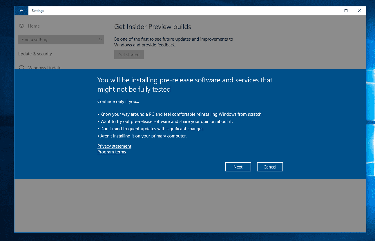 - Once you hit the Get Started button, you will get warned about the roughness of these Insider previews — it’s probably a good idea to review the warnings: