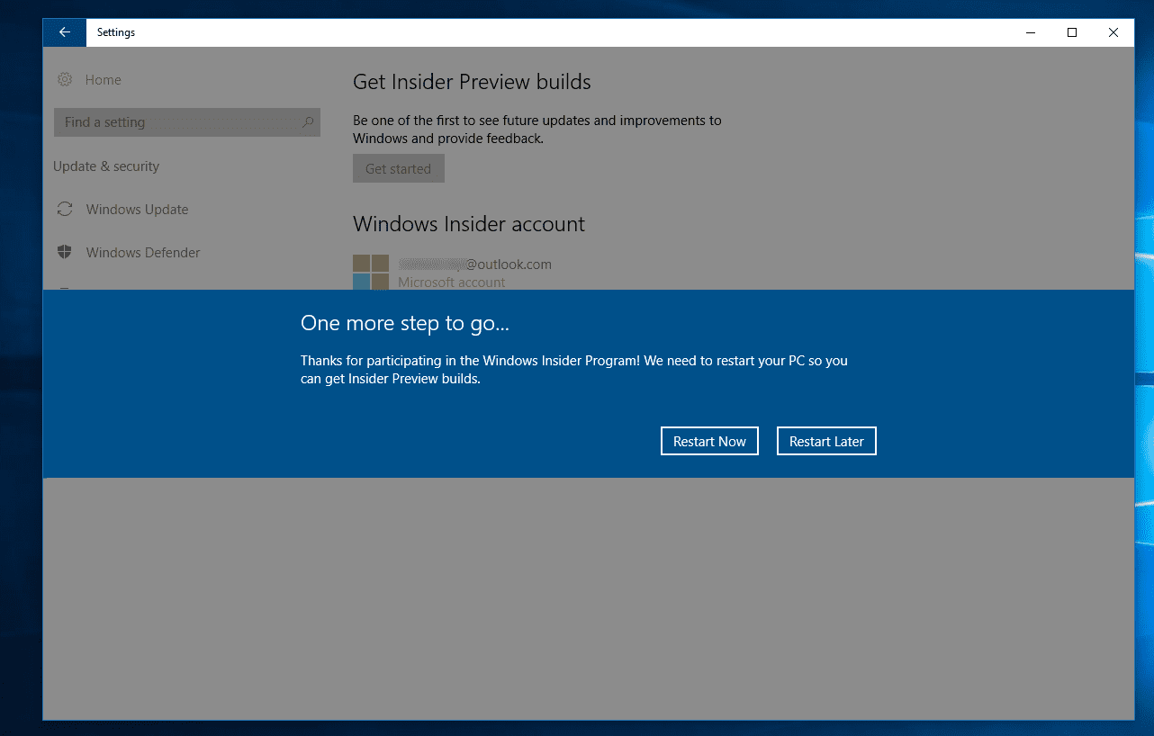 - After that, you will be required to restart your PC to get the latest Insider Preview build. You can choose to restart now, or you can choose to restart later: