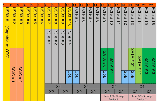 Out of the 22 available high-speed I/O lanes on the H170 (as shown above), 13 are used. Seven HSIO lanes are be used in PCIe mode as per the configuration below.