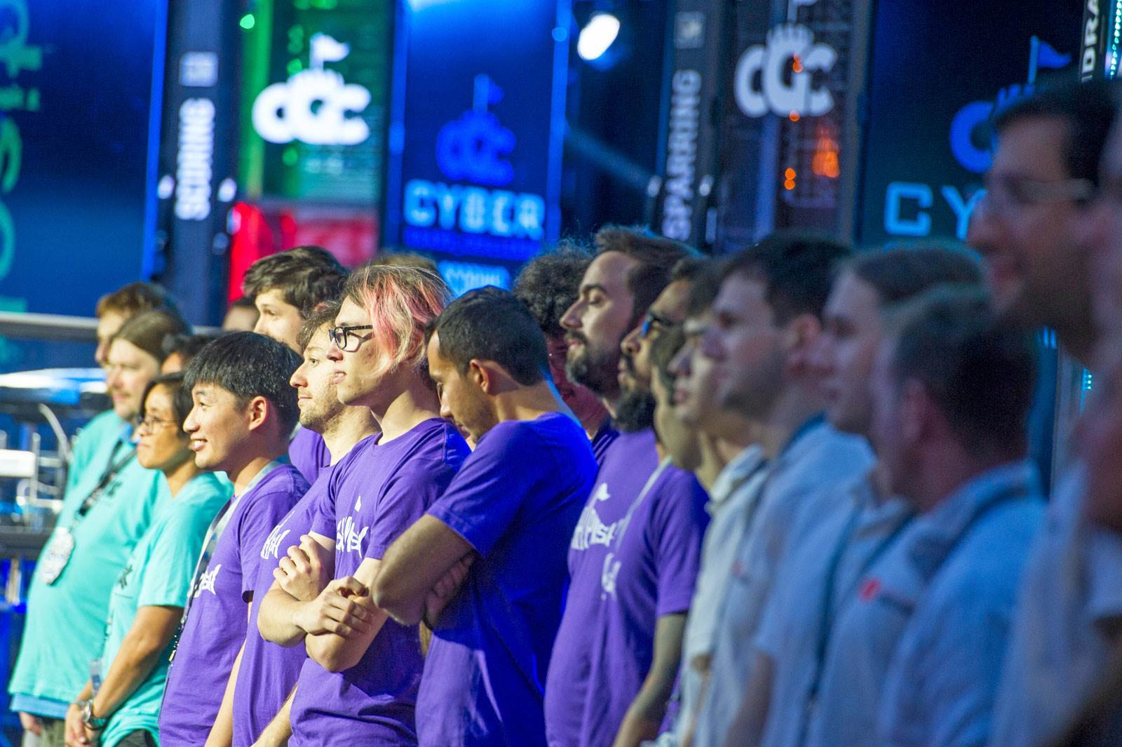 Competing teams line up before the DARPA Cyber Grand Challenge at Def Con 24.