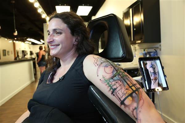 “Yes! That’s awesome!” said Palermo, smiling at a tattoo design that incorporated gears, circuitry, and natural elements like trees and a sunset.