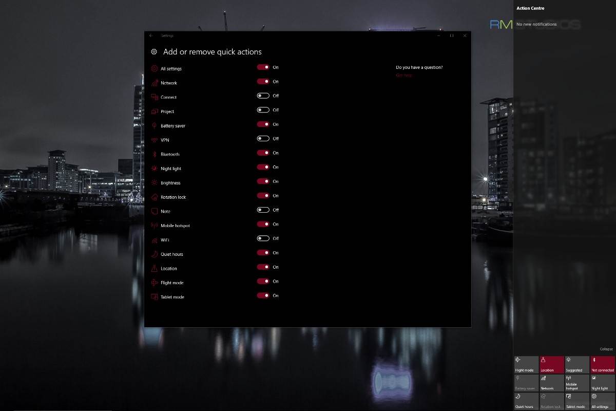 This is because the bottom layer is the default collapsed view and “premium” space. - To remove unused and unneeded quick actions, select the “Add or Remove quick actions” menu. There you can toggle off and on the quick actions, you need. For instance, if you’re on a desktop, you won’t have much need for the tablet mode settings or rotation lock and you can get away with toggling those off.