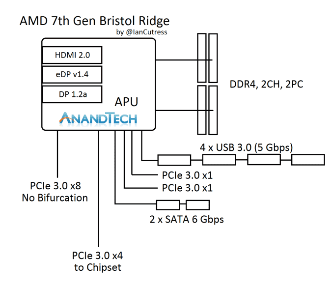 According to some documents obtained by AnandTech, the AMD BIOS treats USB ports from the CPU (because the CPU is an SoC) and USB ports from the 300-series chipset differently. From what we’ve seen, USB support is enabled on the chipset ports, but not on the CPU-based ports. Ryzen is a little different to previous desktop platforms because it can have USB ports from both. For example, here’s a CPU layout from Bristol Ridge and the B350 chipset, each showing USB ports.