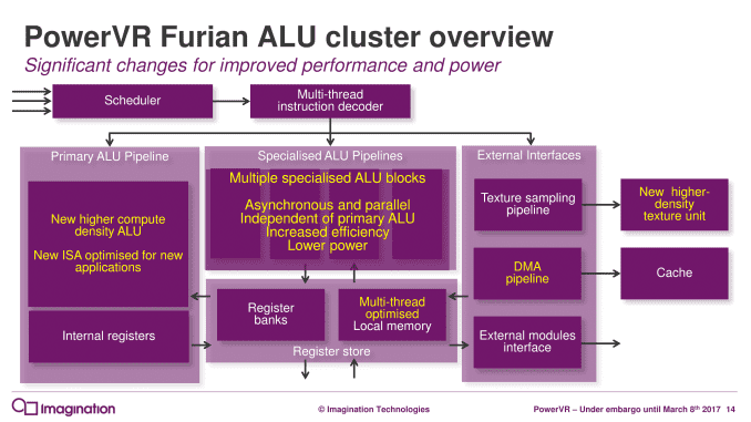 I’ll have a deeper dive into Furian next week, but for today’s launch I want to hit the highlights of the new architecture and what Imagination’s goals are for the GPUs that will be derived from it. On that note, Imagination is not announcing any specific GPU designs today; while close partners already have beta RTL designs, the final designs and the announcement of those designs will come later in the year. But as the mobile industry is a bit more open in terms of design information due to the heavy use of IP licensing and the long design windows, it makes sense for Imagination to start talking this architecture up now, so that developers know what’s coming down the pipe.