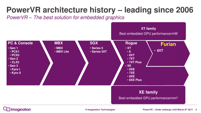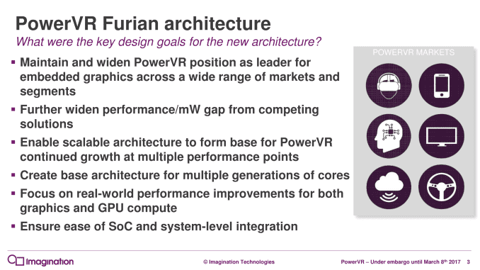Furian marks the first new GPU architecture out of Imagination in almost 7 years. Rogue, the company’s first OpenGL ES 3.x-capable architecture, was first announced in 2010 and has become the cornerstone of Imagination’s entire GPU lineup, from wearables to high-end devices. In the intervening years, Imagination has made a number of smaller updates and optmizations to the architecture, leading to the 6, 7, and 8 series of PowerVR GPU designs. Now the company is undertaking a more radical revision to their architecture in the form of Furian, which like Rogue before it, will ultimately become the cornerstone of their GPU families.