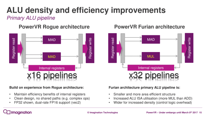 And as you’d expect for a new architecture, Imagination has made several changes under the hood at the ALU Cluster level – the heart of the GPU – in order to improve their GPU designs. The biggest change here – and I dare say most conventional – is that the company has significantly altered their ALU pipeline design. Whereas a full Rogue ALU would contain 16 pipelines per cluster, each composed of a number of ALUs of various sizes capable of issuing MADs (multiply + add), Furian takes things in a wider, less flexible direction.