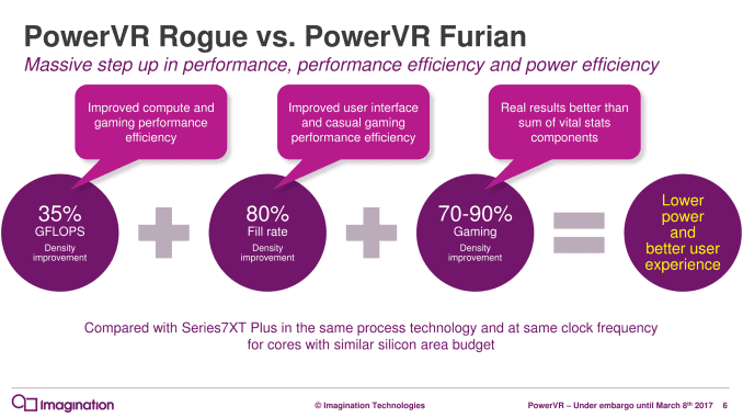 The ultimate goal of Furian is of course to improve power and performance, both on an energy efficiency (perf-per-milliwatt) and area efficiency (perf-per-mm2) basis. In fact it’s interesting that despite the fact that the first Furian designs will be high-end designs, Imagination is still first and foremost promoting area efficiency with Furian. Compared to a similarly sized and clocked Series7XT Plus (Rogue), Imagination is stating that a Furian design would offer 35% better shader performance and 80% better fill rate (though the company’s presentation doesn’t make it clear if this is texel or pixel), with an ultimate performance gain of a rather incredible 70-90%.
