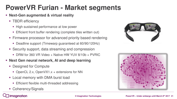 Finally, once Imagination is shipping final Furian designs, the company will be courting customers and downstream users in all of the major high-end markets for embedded GPUs. Besides the obvious high-end phones and GPUs where they’ll go head-to-head with the likes of ARM’s Bifrost architecture, Imagination will also be going after the automotive market, the VR market, and thanks to the compute improvements, the rapidly growing deep learning market. The nature of IP licensing means that end-users are a couple of layers down, so Imagination first needs to court direct customers to build SoCs tailored to these applications, but the capability is there in the IP should customers demand it.