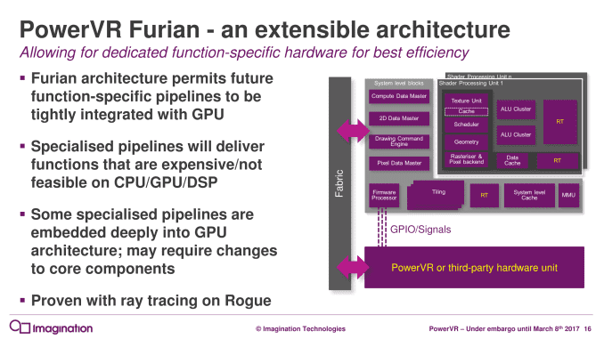 Though for more specialized workloads, in an interesting change Furian will be able to accommodate additional “function-specific” pipelines in customized GPU designs. How this is done is ultimately up to the customer – Imagination just provides the IP and reference RTLs – but the plumbing is there for customers to either add new functional hardware at the block level, or go as low level as the shader processor unit itself to add this hardware. The most obvious candidate here would be ray tracing hardware derived from Imagination’s Wizard architecture, but ultimately it’s up to the customers integrating the GPU IP and how much work they want to put in to add additional blocks.